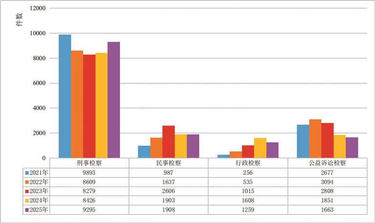 2021年—2025年全區(qū)檢察機(jī)關(guān)“四大檢察”業(yè)務(wù)趨勢變化圖