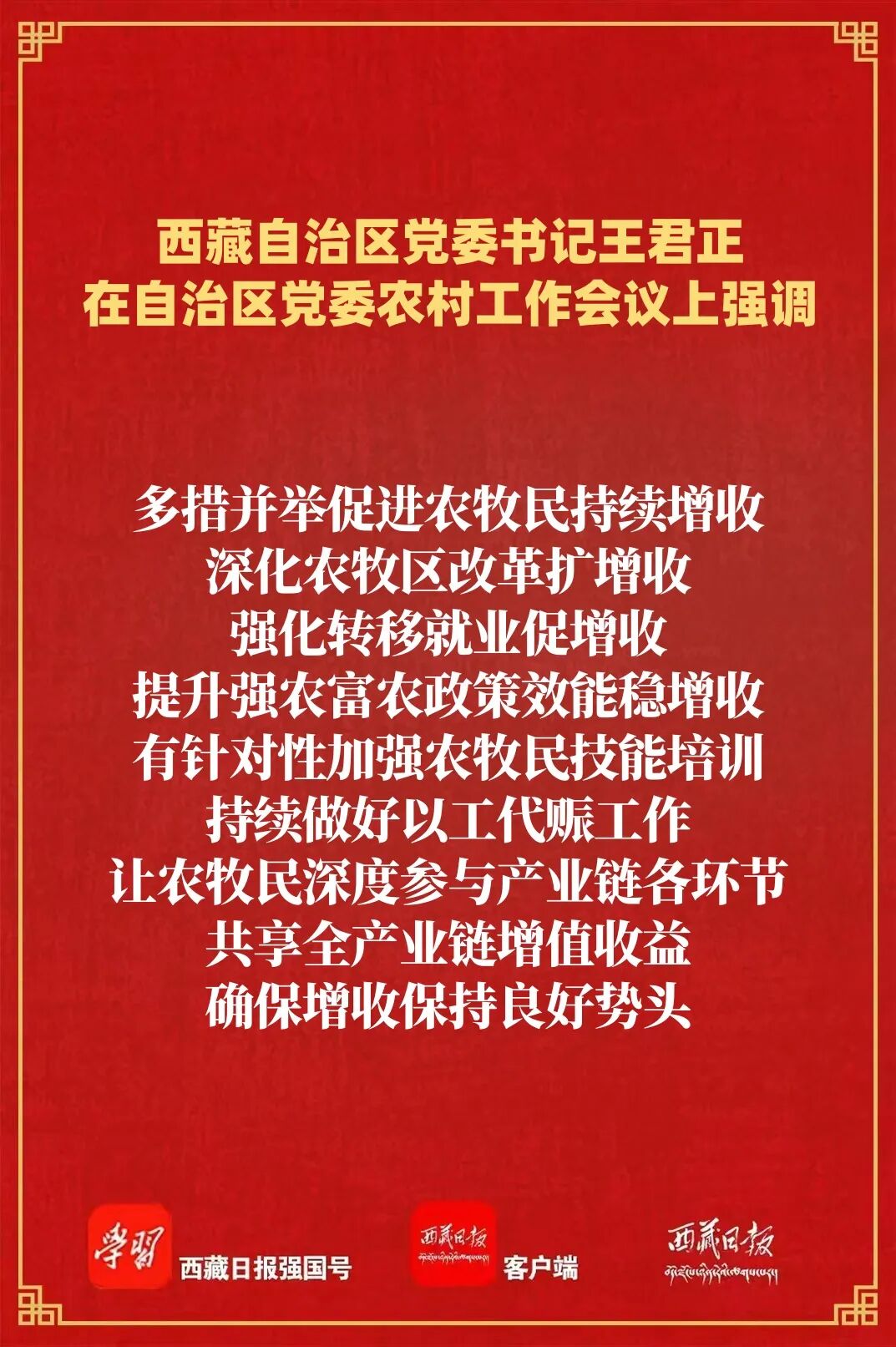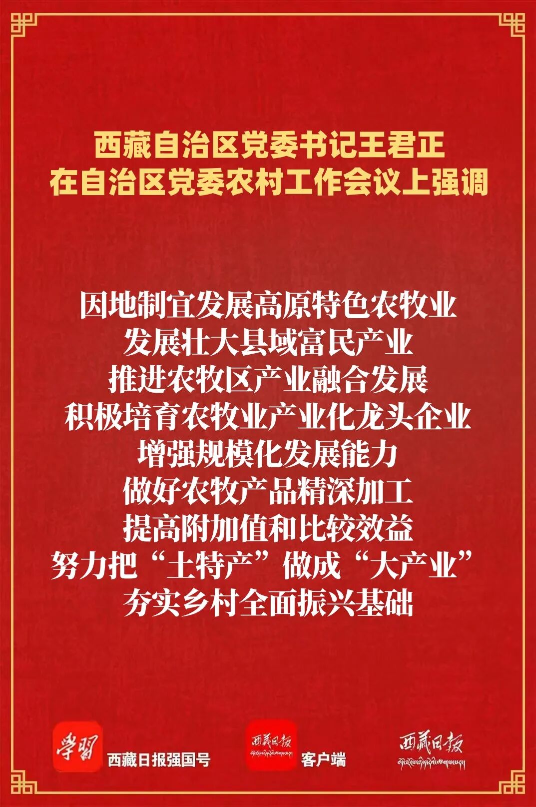 王君正強調(diào),要錨定目標任務,突出工作重點,努力開創(chuàng)我區(qū)農(nóng)業(yè)農(nóng)村現(xiàn)代化、鄉(xiāng)村全面振興新局面。高度重視“三農(nóng)”工作,深刻認識做好“三農(nóng)”工作是全面建設社會主義現(xiàn)代化新西藏、持續(xù)抓好“四件大事”落實、鞏固黨在西藏的執(zhí)政根基的必然要求,大力支持“三農(nóng)”工作,努力實現(xiàn)全區(qū)農(nóng)業(yè)基礎更加穩(wěn)固、農(nóng)村地區(qū)更加繁榮、農(nóng)民生活更加紅火。多措并舉促進農(nóng)牧民持續(xù)增收,深化農(nóng)牧區(qū)改革擴增收,強化轉移就業(yè)促增收,提升強農(nóng)富農(nóng)政策效能穩(wěn)增收,有針對性加強農(nóng)牧民技能培訓,持續(xù)做好以工代賑工作,讓農(nóng)牧民深度參與產(chǎn)業(yè)鏈各環(huán)節(jié),共享全產(chǎn)業(yè)鏈增值收益,確保增收保持良好勢頭。大力實施常態(tài)化精準幫扶,及時精準做好監(jiān)測識別,分類做好常態(tài)化幫扶,筑牢兜底保障防線,堅持把產(chǎn)業(yè)幫扶作為根本措施,優(yōu)化產(chǎn)業(yè)幫扶方式,不斷提升幫扶實效,確保不發(fā)生規(guī)模性返貧致貧。著力提升糧食和重要農(nóng)產(chǎn)品產(chǎn)能,毫不放松抓好糧食特別是青稞生產(chǎn),加強耕地保護和高標準農(nóng)田建設,加強畜牧業(yè)和“菜籃子”產(chǎn)品生產(chǎn)供給,強化農(nóng)牧業(yè)科技賦能,加大氣象監(jiān)測預報預警力度,增強農(nóng)牧業(yè)防災減災能力。因地制宜發(fā)展高原特色農(nóng)牧業(yè),發(fā)展壯大縣域富民產(chǎn)業(yè),推進農(nóng)牧區(qū)產(chǎn)業(yè)融合發(fā)展,積極培育農(nóng)牧業(yè)產(chǎn)業(yè)化龍頭企業(yè),增強規(guī)模化發(fā)展能力,做好農(nóng)牧產(chǎn)品精深加工,提高附加值和比較效益,努力把“土特產(chǎn)”做成“大產(chǎn)業(yè)”,夯實鄉(xiāng)村全面振興基礎。加快推進高原和美鄉(xiāng)村建設,深入學習運用“千萬工程”經(jīng)驗,加快農(nóng)牧區(qū)基礎設施建設,提高教育、醫(yī)療、社保等公共服務水平,持續(xù)整治提升農(nóng)牧區(qū)人居環(huán)境,把農(nóng)牧區(qū)建設得更加宜居宜業(yè)。提高鄉(xiāng)村治理水平,持續(xù)加強黨建引領,充分發(fā)揮基層黨組織戰(zhàn)斗堡壘作用,深化文明鄉(xiāng)風建設,推動形成向上向善的鄉(xiāng)村道德風尚;堅持和發(fā)展新時代“楓橋經(jīng)驗”,不斷提升基層治理體系和治理能力現(xiàn)代化水平,確保農(nóng)牧區(qū)持續(xù)和諧穩(wěn)定。