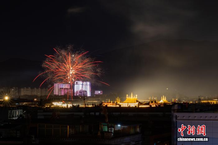 圖為2月16日晚,拉薩北京東路煙花綻放與遠(yuǎn)處的布達(dá)拉宮交相輝映。中新社記者 江飛波 攝