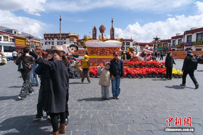 3月14日,拉薩陽光明媚,市民、游客等在大昭寺廣場巨型切瑪盒(藏歷新年吉祥物)前合影留念。中新社記者 江飛波 攝