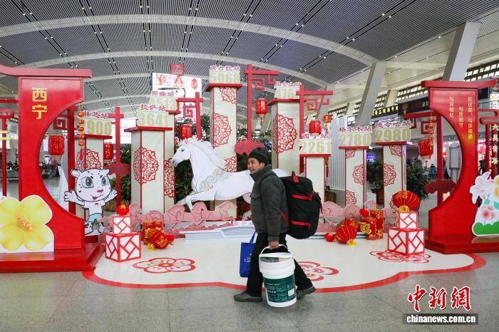 2月2日,2026年中國春運(yùn)首日,旅客從西寧火車站裝扮的馬年氛圍裝飾區(qū)前走過。馬銘言 攝