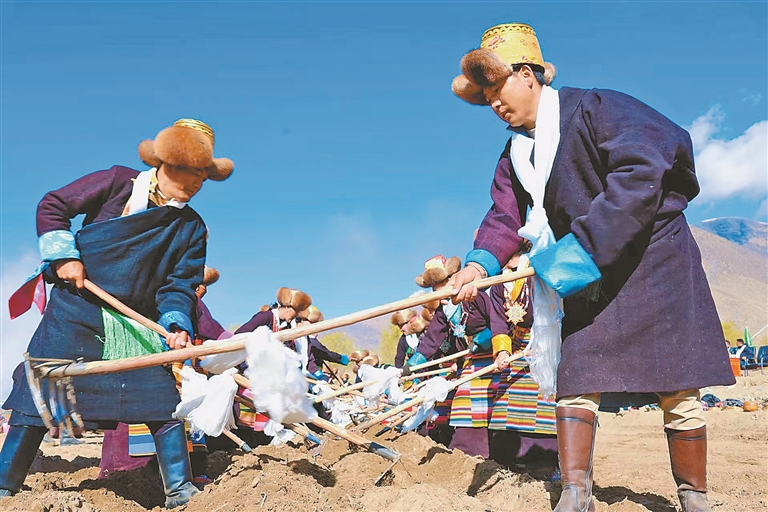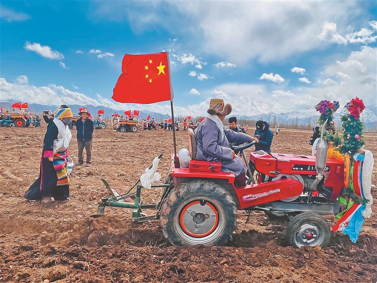 開耕儀式上,村民身著節(jié)日盛裝,聚在田間地頭,拖拉機(jī)等農(nóng)機(jī)設(shè)備擦拭一新,機(jī)頭鮮艷的五星紅旗迎風(fēng)招展。大家捧出切瑪盒,一字排開,互獻(xiàn)哈達(dá)、互敬青稞酒、同唱祝福歌,每個(gè)人臉上都洋溢著對(duì)豐收年景的期盼。
