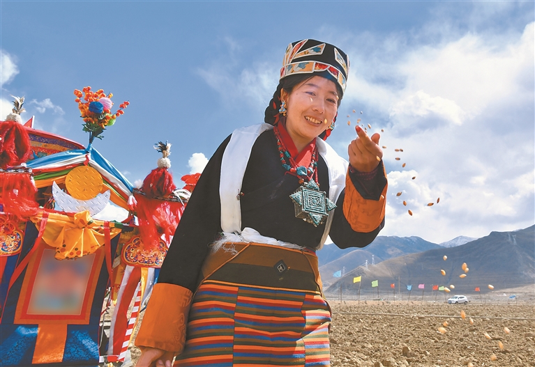 在納木那尼峰下、孔雀河畔,阿里地區(qū)普蘭縣多油村群眾身著節(jié)日盛裝舉行傳統(tǒng)春播儀式,以傳統(tǒng)民俗開啟新一年農(nóng)耕生產(chǎn)。