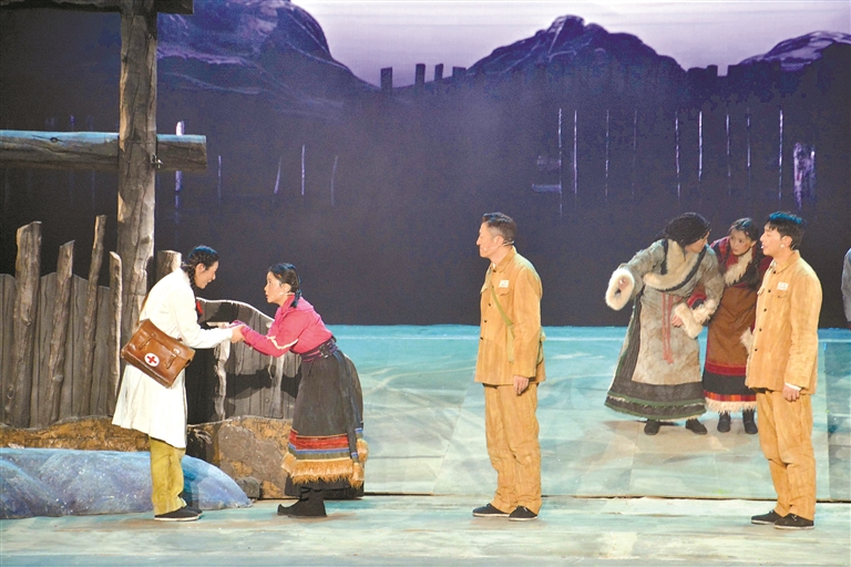 舞臺上,5名隨十八軍進藏的知識青年,在險象環(huán)生的進藏路上結(jié)下了深厚的革命情誼,并組成“五星小隊”。他們發(fā)揮各自所長,背著藥箱翻山越嶺為藏族群眾治病,在帳篷里辦起小學(xué),在草原上建起獸醫(yī)站……一個個真實鮮活的場景,織就了一幅跨越數(shù)十年的歷史長卷,譜寫了一曲老西藏精神的贊歌。