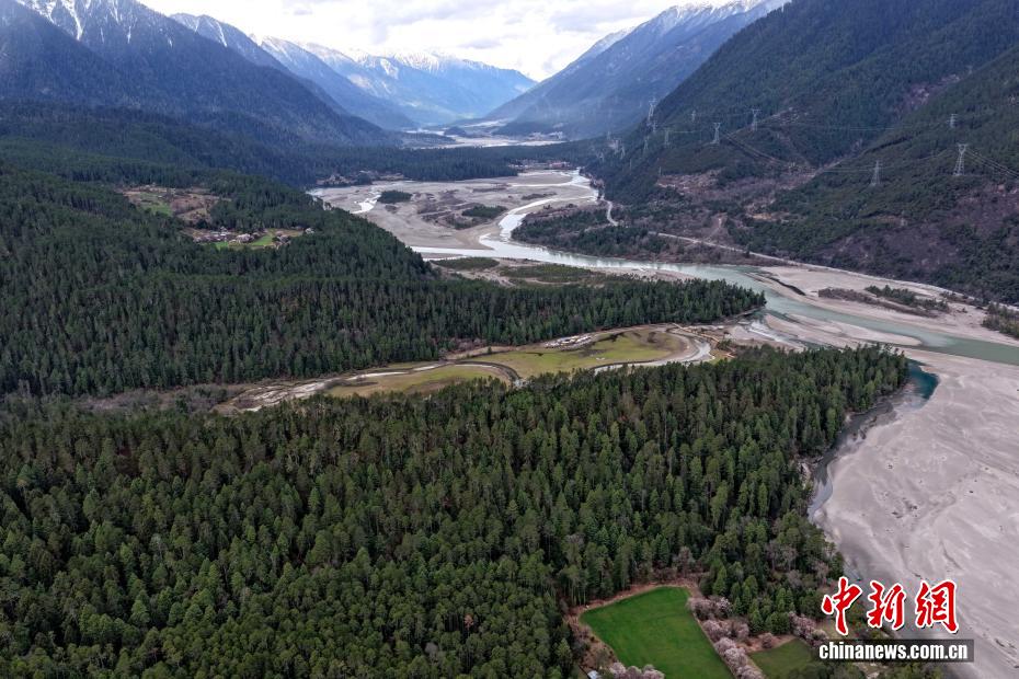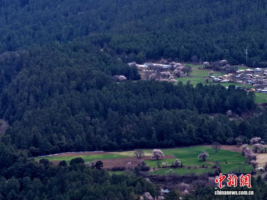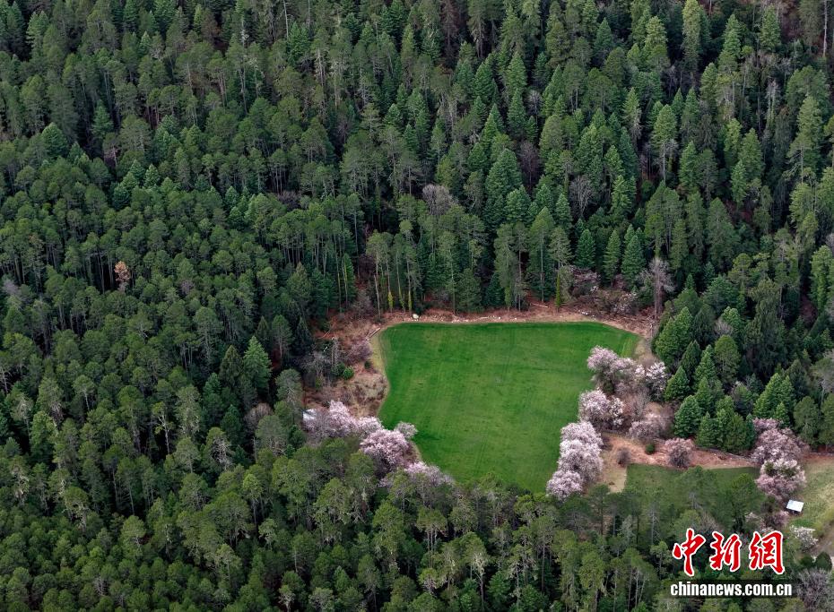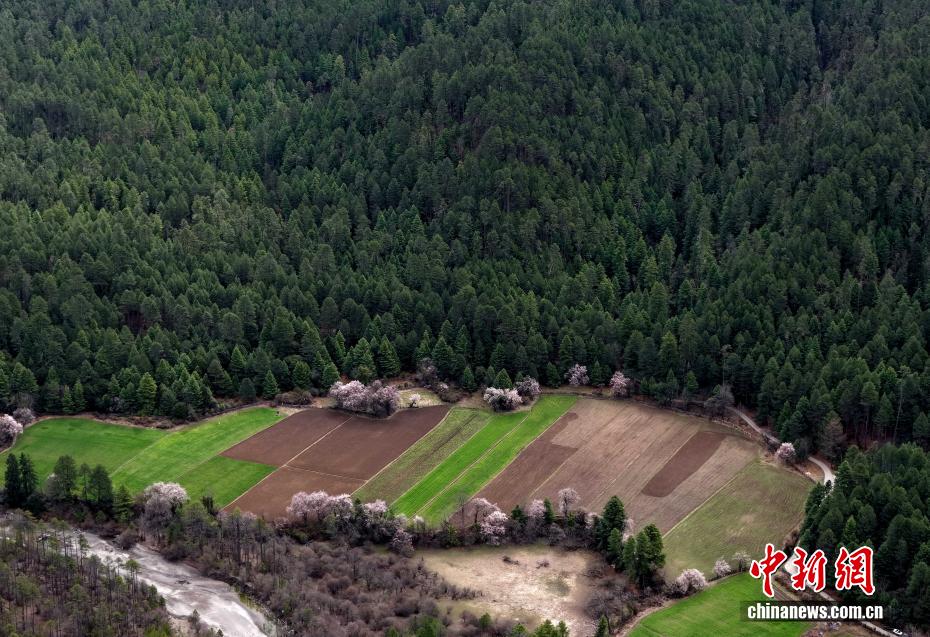 3月26日,西藏波密桃花林海相映成趣。崗云杉林位于西藏林芝市波密縣,森林覆蓋率達(dá)61%以上,海拔2700米左右。俯瞰崗云杉林,周邊桃花綻放,與密林、農(nóng)田構(gòu)成美麗自然畫卷。(無(wú)人機(jī)照片)中新社記者 李林 攝