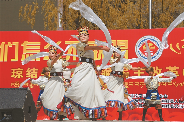 圖為3月27日,山南市瓊結(jié)縣青瓦達孜廣場上歡歌笑語、人頭攢動。為紀念西藏民主改革67周年,一場以“叫我們怎么不歌唱”為主題的文藝演出在此舉行。圖為活動演出現(xiàn)場。倫珠澤仁 記者 白瑪澤旺 攝