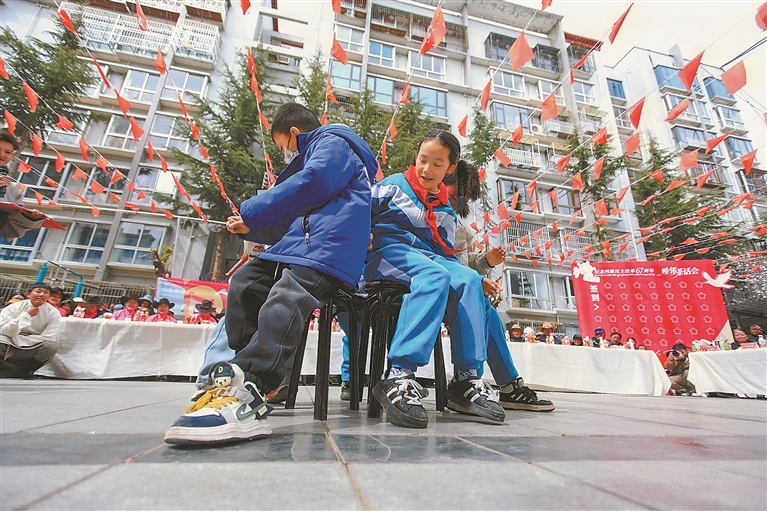 圖為3月27日下午,為紀念西藏民主改革67周年,城關(guān)區(qū)尼卓林社區(qū)黨總支在蜀園小區(qū)廣場舉辦“銘記歷史·感恩新時代”主題黨日暨“睦鄰茶話會”活動,眾多居民踴躍參與。圖為孩子們在進行搶凳子游戲。記者 王敏 攝