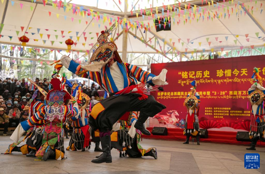 3月28日,演員在拉薩市宗角祿康公園內(nèi)舉辦的西藏百萬農(nóng)奴解放紀(jì)念日群眾演出活動上表演。新華社記者 晉美多吉 攝