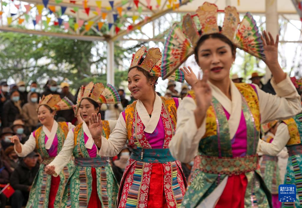 3月28日,演員在拉薩市宗角祿康公園內(nèi)舉辦的西藏百萬農(nóng)奴解放紀(jì)念日群眾文藝演出活動上載歌載舞。新華社記者 晉美多吉 攝