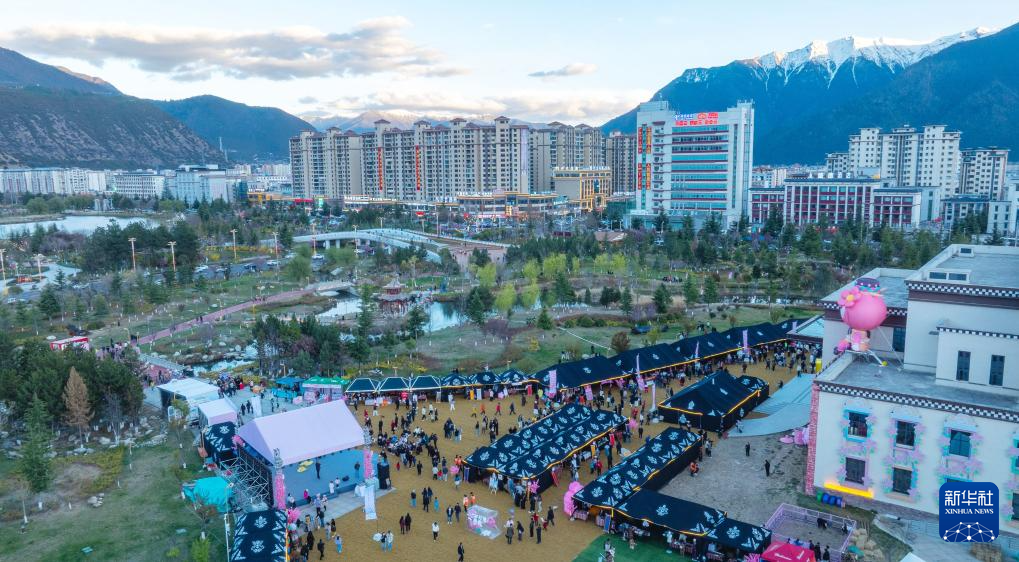 這是4月3日拍攝的林芝第二十三屆桃花旅游文化節(jié)“堆春行動”集市現(xiàn)場(無人機照片)。新華社記者 丁增尼達 攝