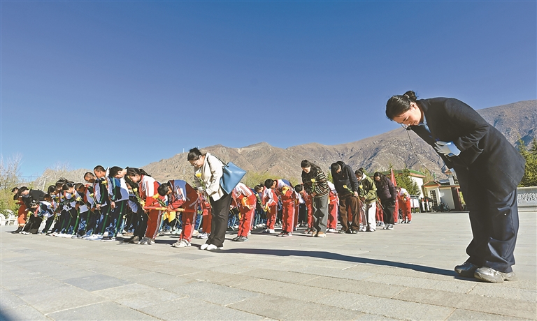 拉薩市中小學(xué)生代表在拉薩烈士陵園革命烈士紀念碑前鞠躬致敬。記者 唐斌 白瑪澤旺 攝