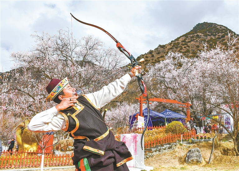 桃林間,藏歌悠揚,響箭聲動,阿媽端出香甜的酥油茶,阿爸打起牧牛的“烏爾朵”,年輕的男男女女跳起歡快的“工布博”。