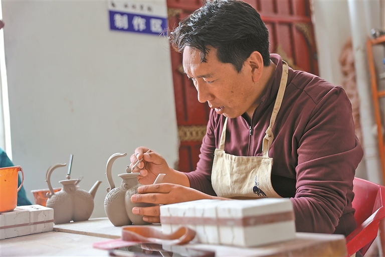 公司實(shí)行“按勞計(jì)酬”的薪酬制度,為員工提供了穩(wěn)定的收入保障。這份“家門(mén)口”的可觀(guān)收入,讓員工們穩(wěn)穩(wěn)撐起了家庭的幸福生活?!耙郧霸诩曳N地,收入不穩(wěn)定,現(xiàn)在在公司做黑陶,不僅學(xué)到了一門(mén)手藝,每個(gè)月還有固定工資,日子越過(guò)越有盼頭了!”作為曲珠的第一批學(xué)生,扎西如今已能獨(dú)立設(shè)計(jì)制作復(fù)雜的黑陶茶具,月薪穩(wěn)定在5000元左右,他的感慨道出了所有員工的心聲。這些扎根鄉(xiāng)土的手藝人,不僅用雙手改變了生活,更因?qū)@門(mén)技藝的熱愛(ài)與堅(jiān)守,成為察雅黑陶傳承路上的重要力量。