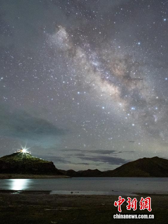 西藏山南羊卓雍錯(cuò)日托寺,因?yàn)楹0胃?、遠(yuǎn)離城市光污染,是理想的觀星之地。近日,海拔4400多米的寺廟夜空清澈,銀河清晰可見,璀璨星辰與羊卓雍錯(cuò)相映成趣,吸引游客和攝影愛好者觀星拍攝。圖為日托寺(燈光處)上空銀河璀璨。江飛波 攝