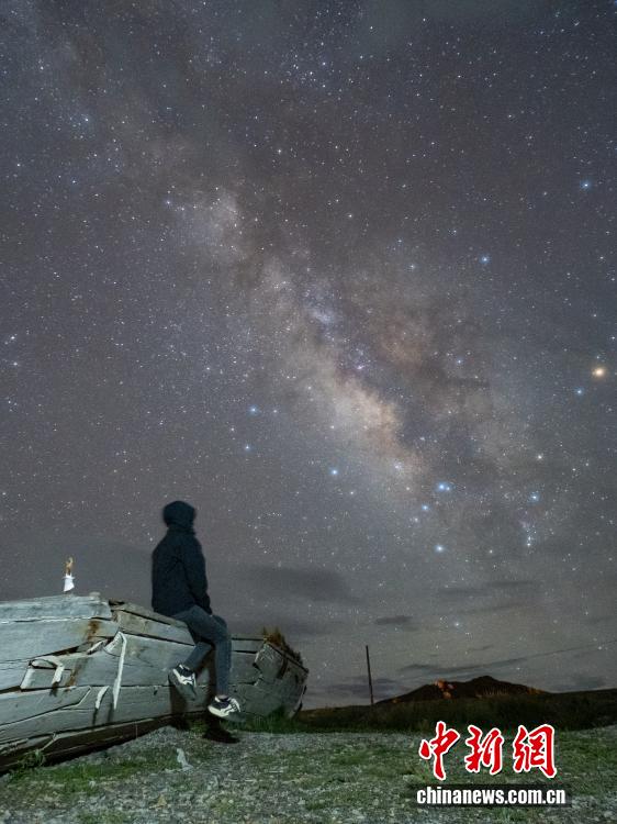 西藏山南羊卓雍錯(cuò)日托寺,因?yàn)楹0胃摺⑦h(yuǎn)離城市光污染,是理想的觀星之地。近日,海拔4400多米的寺廟夜空清澈,銀河清晰可見,璀璨星辰與羊卓雍錯(cuò)相映成趣,吸引游客和攝影愛好者觀星拍攝。圖為游客在羊卓雍錯(cuò)日托寺附近與銀河“打卡”。江飛波 攝
