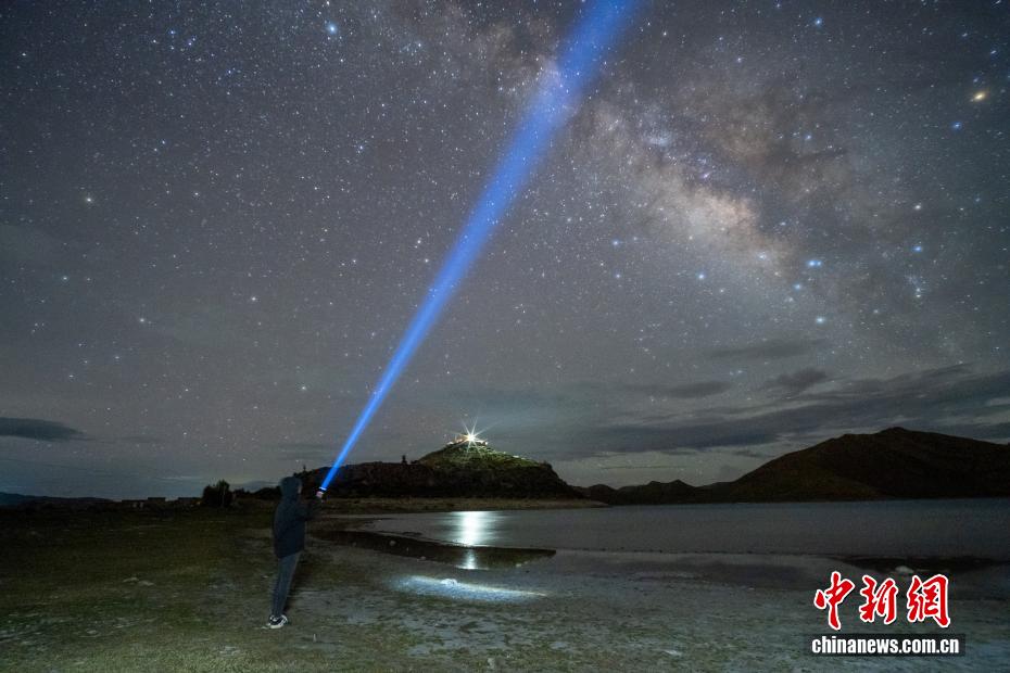 西藏山南羊卓雍錯(cuò)日托寺,因?yàn)楹0胃?、遠(yuǎn)離城市光污染,是理想的觀星之地。近日,海拔4400多米的寺廟夜空清澈,銀河清晰可見,璀璨星辰與羊卓雍錯(cuò)相映成趣,吸引游客和攝影愛好者觀星拍攝。圖為游客在羊卓雍錯(cuò)湖邊與銀河“打卡”。江飛波 攝