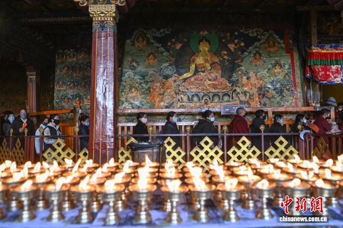 11月28日,西藏拉薩,信眾在大昭寺里排隊朝拜。西藏進入冬季農(nóng)閑期,眾多藏傳佛教信眾從各地匯聚到拉薩,圍繞林廓轉經(jīng)路、大昭寺等地轉經(jīng)、禮佛、朝拜。中新社記者 貢嘎來松 攝