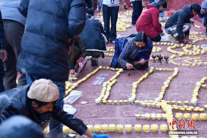 圖為信眾在甘丹寺有序擺放酥油燈。 中新社記者 貢嘎來松 攝