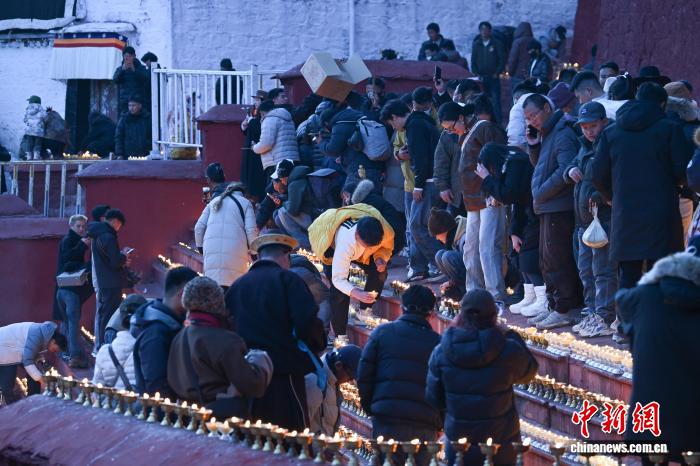 12月14日即藏歷十月二十五日,是藏傳佛教格魯派燃燈日。在西藏拉薩市的藏傳佛教格魯派祖寺甘丹寺內(nèi),信眾點燃酥油燈,祈福平安吉祥。“燃燈日”是紀念藏傳佛教格魯派創(chuàng)始人宗喀巴大師圓寂而舉行的活動,已有600多年歷史。圖為信眾在甘丹寺內(nèi)點酥油燈?! ≈行律缬浾?貢嘎來松 攝