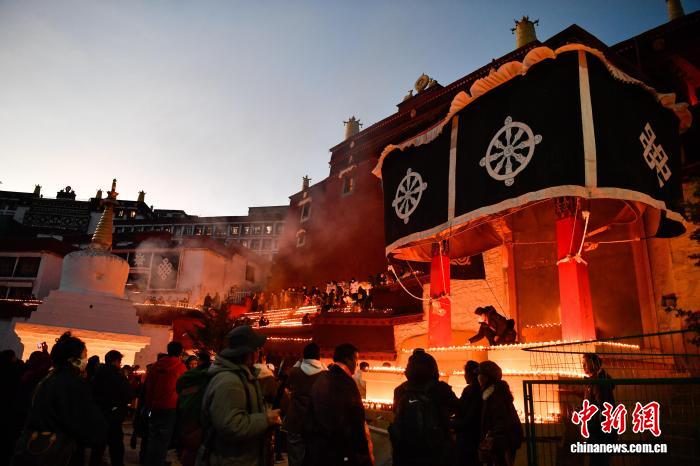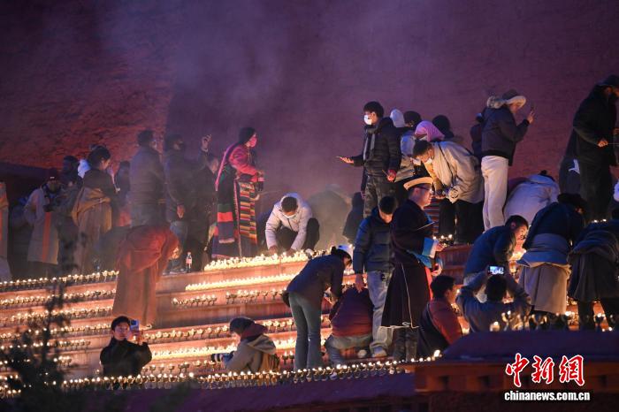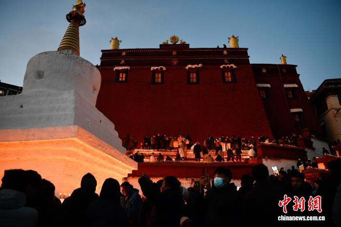圖為信眾在甘丹寺內(nèi)點酥油燈。 中新社記者 貢嘎來松 攝