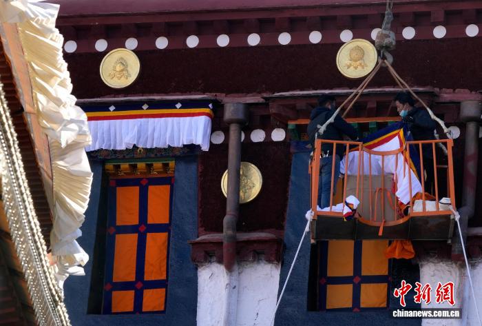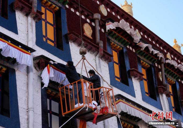 2月5日,西藏大昭寺更換“香布”,迎藏歷新年。“香布”是藏式建筑的裝飾,通常用五彩棉布縫制,主體為白色,搭配紅藍(lán)黃等色的邊沿,對窗沿等的顏料及木構(gòu)件起到保護(hù)作用。圖為工人們正乘坐吊車更換大昭寺“香布”。中新社記者 李林 攝