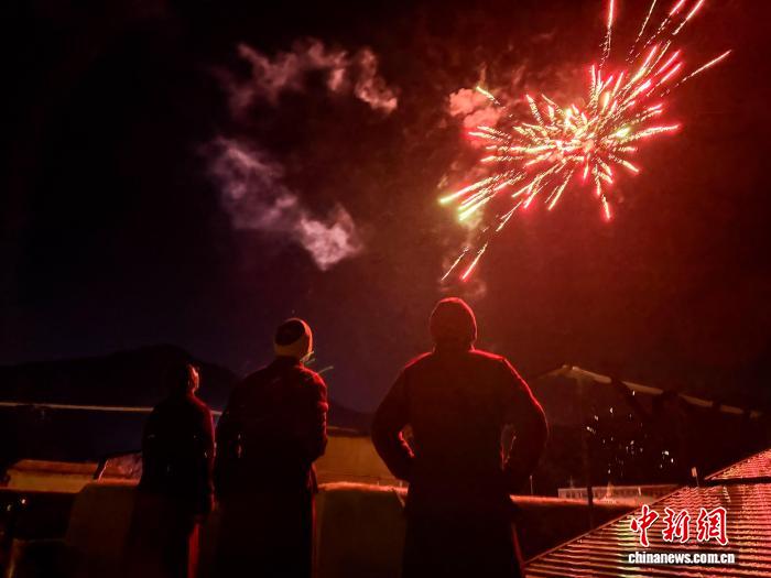 2月16日“古突”夜,桑耶寺僧人在房頂看煙花。中新社記者 趙朗 攝