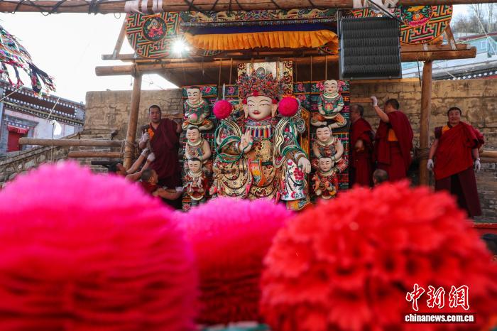 3月3日,青海省西寧市湟中區(qū)塔爾寺僧人將上花院的酥油花主尊——文殊菩薩固定在花架上?!●R銘言 攝