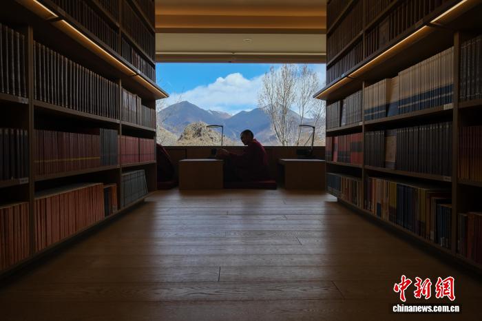 4月23日,拉薩乃朗寺圖書館內(nèi),一位僧人在閱讀,他身旁的書架上是浩瀚的經(jīng)書典籍。中新社記者 江飛波 攝