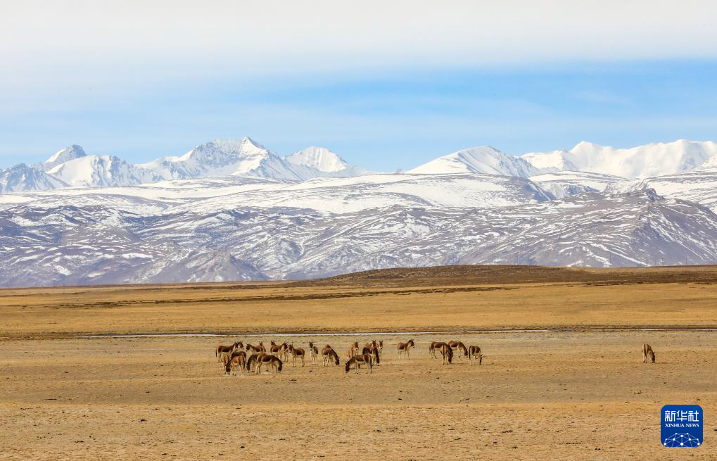 3月29日,藏野驢在西藏阿里地區(qū)普蘭縣境內雪山下覓食。新華社發(fā)(劉曉東攝)