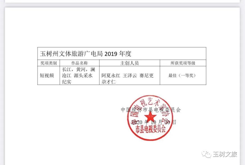 在當(dāng)天舉行的第八屆全國市縣電視臺、融媒體中心推優(yōu)展播活動表彰晚會上,全國100多家市縣電視臺、融媒體中心的代表和來自全國各地的領(lǐng)導(dǎo)、嘉賓齊聚?;顒蝇F(xiàn)場頒發(fā)了最佳短視頻單位、最佳電視專題單位、最佳電視欄目單位、最佳綜藝晚會單位、媒體融合先導(dǎo)單位等獎項。玉樹藏族自治州文體旅游廣電局獲最佳短視頻單位,其2019年度短視頻作品《長江、黃河、瀾滄江源采水紀實宣傳片》獲得“最佳短視頻一等獎”榮譽。