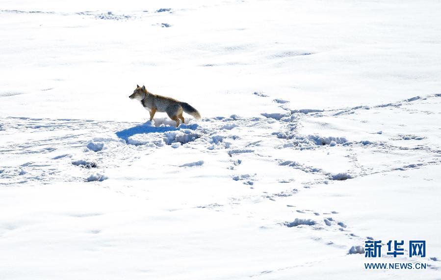 正在覓食的藏狐悠閑漫步在茫茫雪原,走走停停,只留下深深淺淺的小腳印……幾乎隨處可見的高原精靈,為冬日高原增添了無限生機。