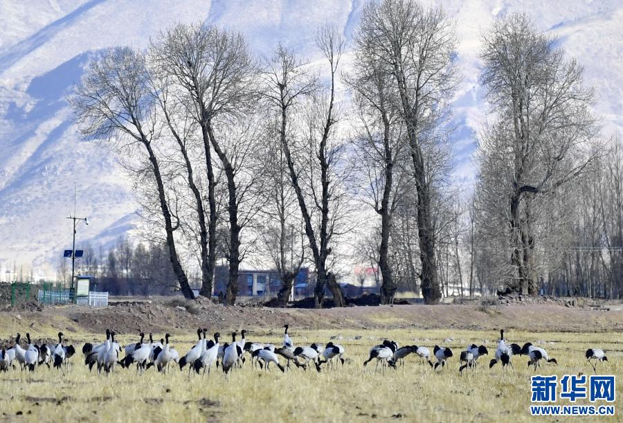 這是12月12日在林周縣黑頸鶴自然保護區(qū)卡孜鄉(xiāng)拍攝的黑頸鶴。新華社記者 黃豁 攝