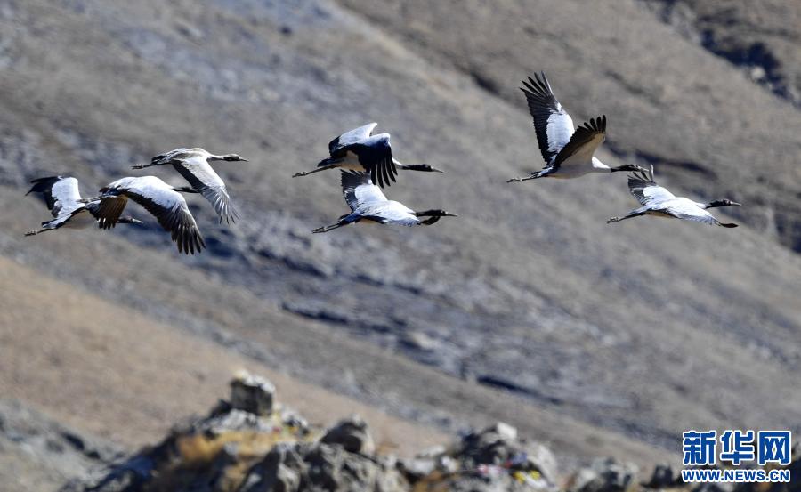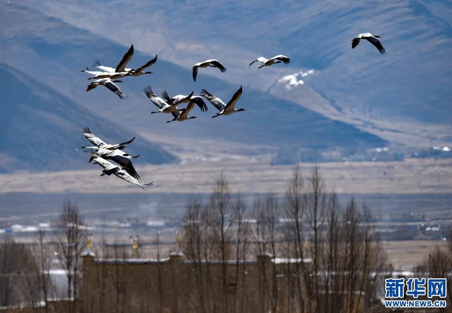 飛翔在林周縣黑頸鶴自然保護區(qū)上空的黑頸鶴集群(12月12日攝)。新華社記者 黃豁 攝