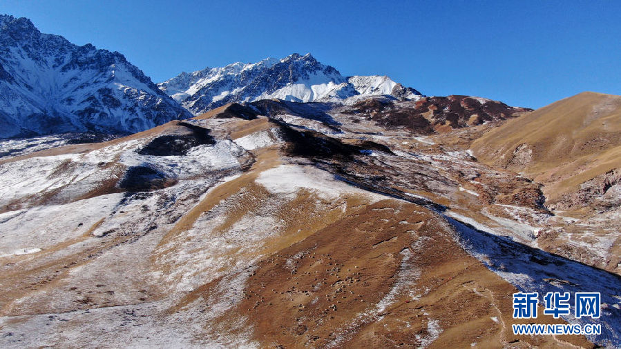 在青海省祁連縣,羊群在雪山下的草原上活動(dòng)(12月8日攝,無(wú)人機(jī)照片)。新華社記者 張宏祥 攝