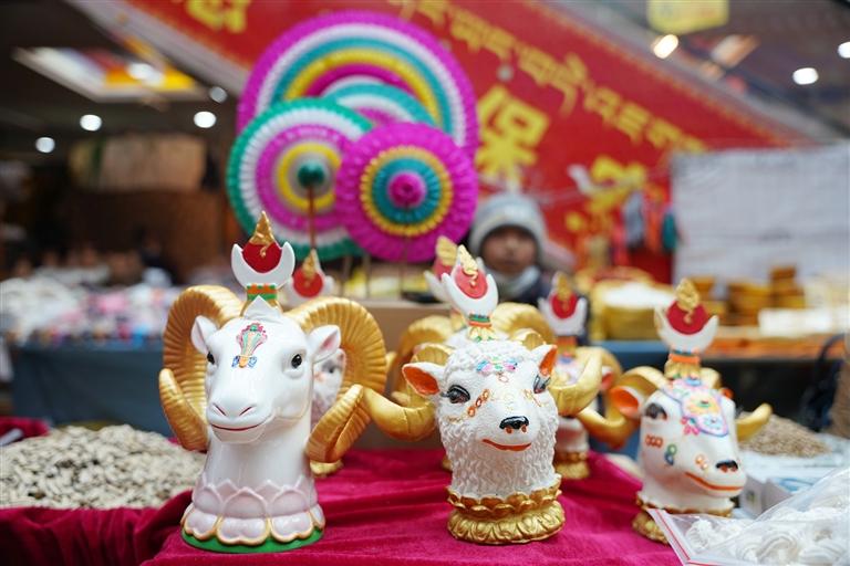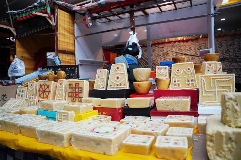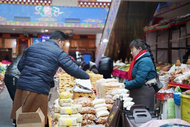 2月16日,記者來到拉薩市八廓商城與沖賽康市場。風(fēng)干肉、羅薩梅朵、卡賽、切瑪盒……攤位上各類年貨琳瑯滿目,一應(yīng)俱全,置辦年貨的人們?nèi)宄扇旱剡呑哌吿暨x自己中意的物品,準(zhǔn)備歡度藏歷新年。走進八廓商城立馬便被里面熱鬧的場景所吸引,詢貨問價的聲音不絕于耳。走到攤前,不等顧客開口,店家便會熱情地推銷起自己的貨物。