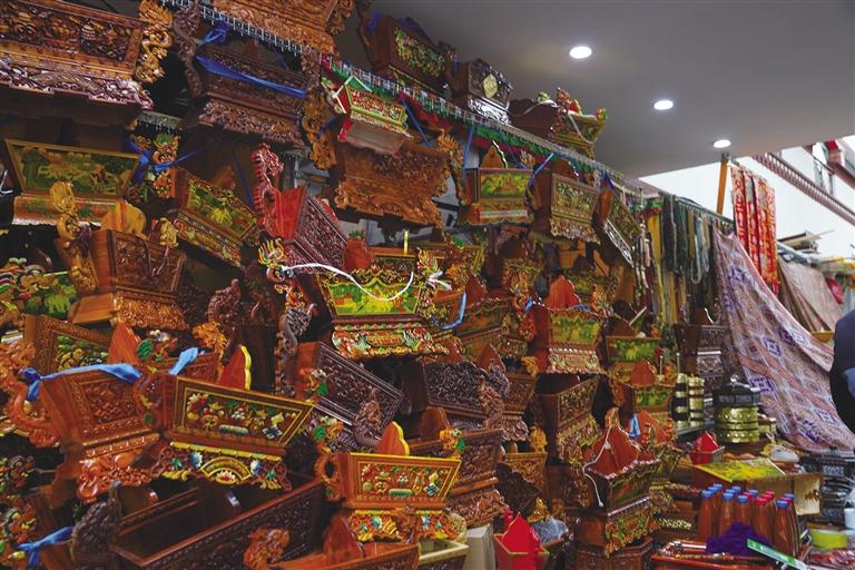 巴桑站在店門口展示著自家的切瑪盒,“我們家的切瑪盒做的可是一絕,而且不會因為快過年了就胡亂加價,50元至500元的都有,很多顧客都是從其他地方趕過來買。你看上面插的酥油花,這也是我父親做的,別看不大,每個都要兩三個小時才能做好?!卑蜕Uf。