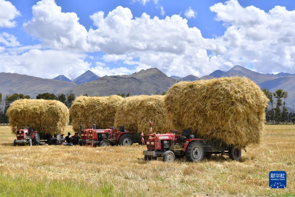 9月21日,拉薩市林周縣邊林鄉(xiāng)當(dāng)杰村的村民在收集秸稈。新華社記者 覺果 攝