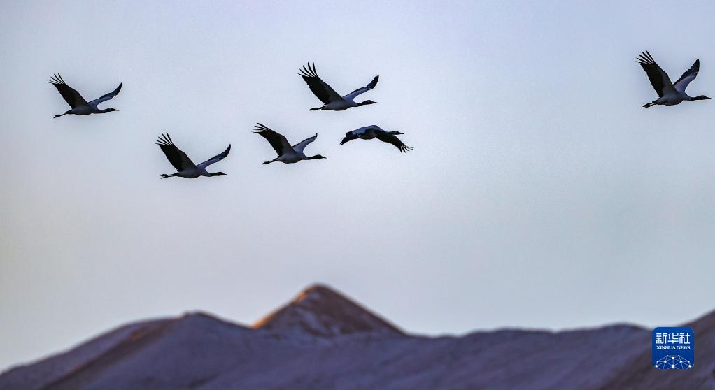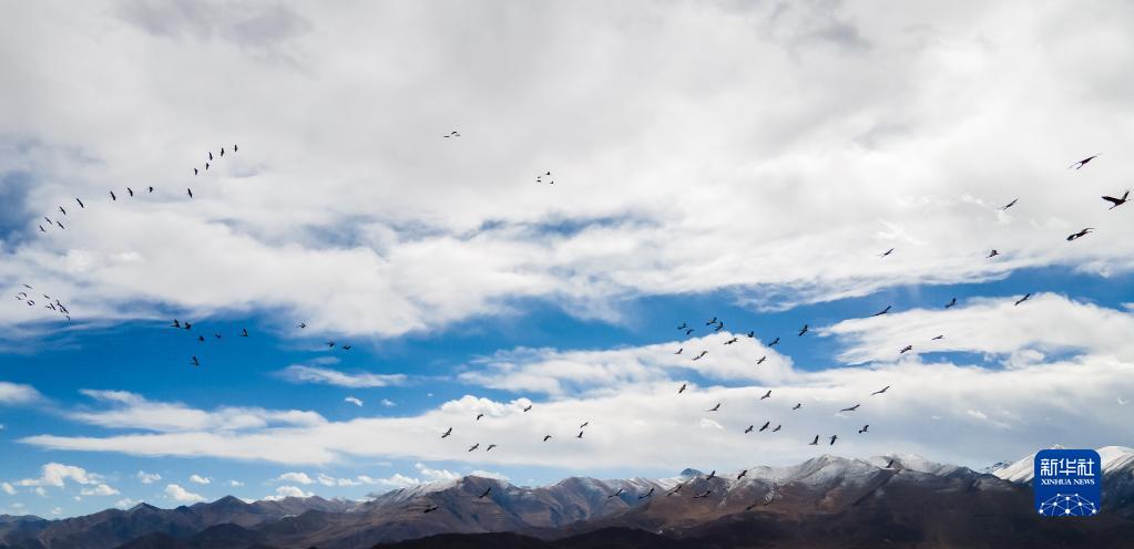 黑頸鶴群飛過林周縣強嘎鄉(xiāng)境內山梁(11月6日攝)。新華社記者 姜帆 攝