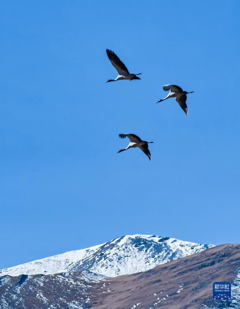 黑頸鶴在林周縣強嘎鄉(xiāng)上空飛翔(11月6日攝)。新華社記者 周荻瀟 攝