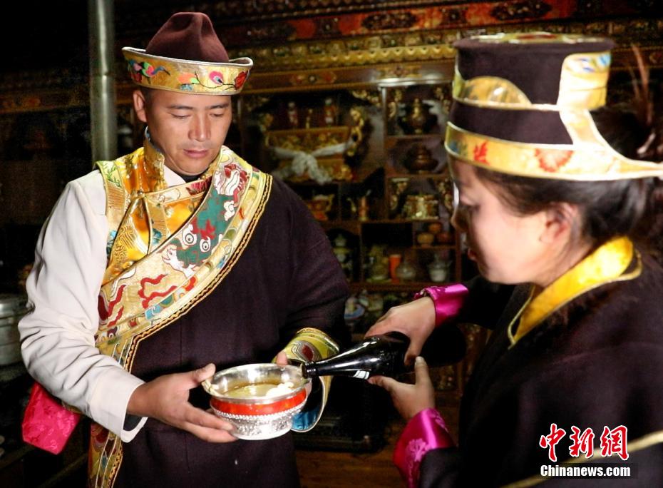 11月24日恰逢藏歷十月初一,西藏林芝迎來2023年工布新年,這是西藏最早的新年。工布新年以其悠久的歷史、鮮明的特色、豐富的內(nèi)涵,于2006年被列入第一批西藏自治區(qū)非物質(zhì)文化遺產(chǎn)保護名錄。圖為村民向客人敬酒。 阿仁 攝