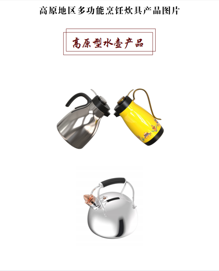 西藏自治區(qū)海拔跨度大,人民群眾生活范圍主要在800米至5000米左右,針對不同海拔高度需要不同烹飪壓力及不同烹飪時間的需求,研發(fā)的高原地區(qū)多功能烹飪炊具可實現一鍵調壓、多檔控壓和感溫定時功能。新研發(fā)的壓力鍋針對不同的海拔地區(qū)可以實現不同的壓力控制,從而在不同的沸點均能快速煮熟食物,實現與區(qū)外煮熟時間相同,且兼具口感,并保留食物更多的營養(yǎng)成分。新研發(fā)的高原地區(qū)專用燒水壺(明火款、電子款)也實現了在不同海拔地區(qū)均能與區(qū)外相同時間使壺內水沸騰后達到100℃,從而保障高原地區(qū)廣大群眾都能喝上燒開的水?! ?/p>