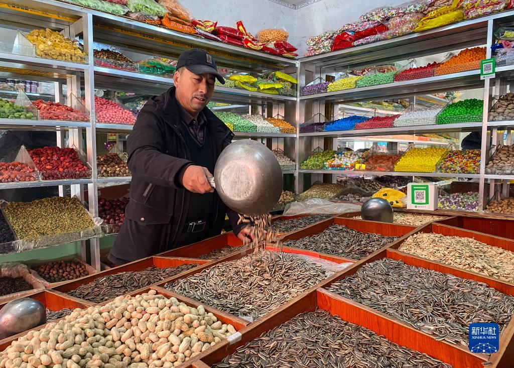 2月1日,王西木售賣(mài)干果和各色糖果。新華社記者春拉 攝