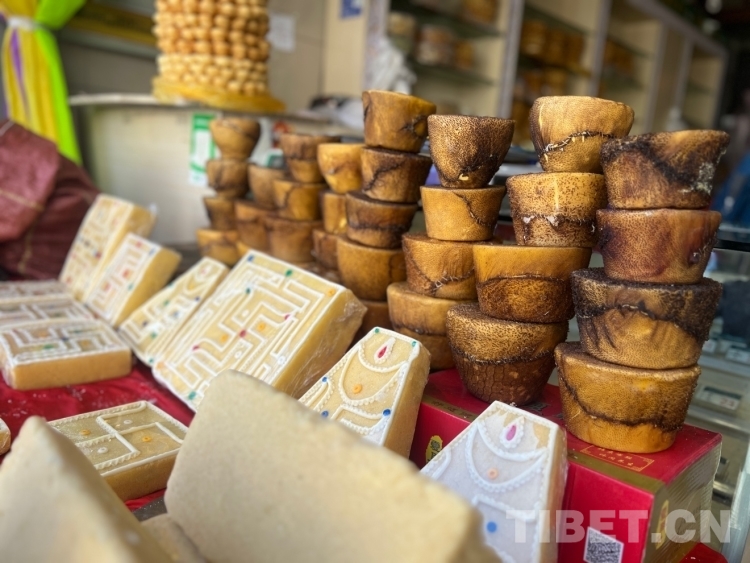 圖為年貨市場里的“退”(奶渣糕)和酥油 攝影:德吉卓瑪