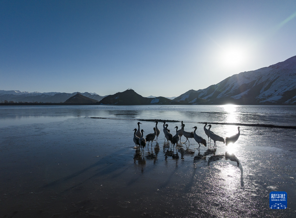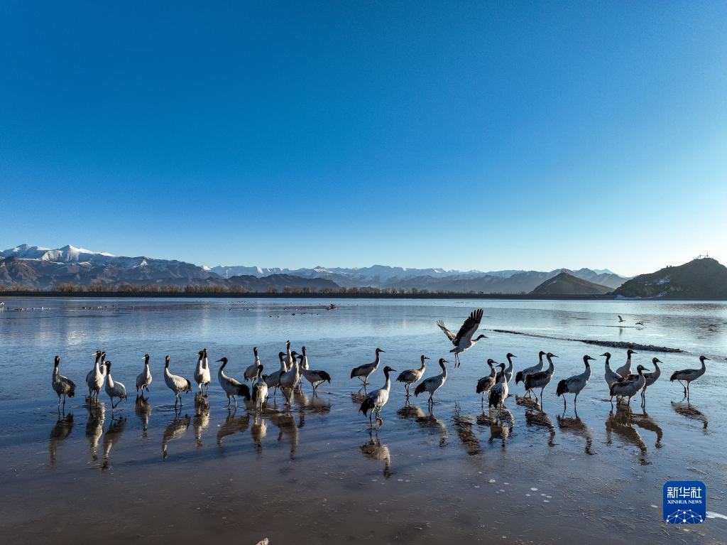 拉薩市林周縣卡孜水庫拍攝的黑頸鶴(3月1日攝,無人機照片)。新華社記者 孫非 攝