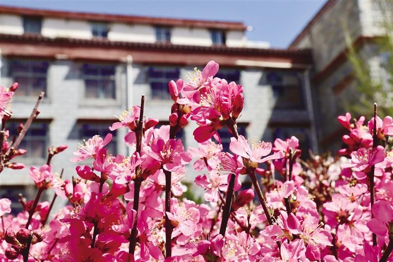 那么,去哪里查收這份“春日限定大禮包”呢?最近幾天,記者的朋友圈都被帕崩崗的美景霸屏了,一波又一波的朋友到這里打卡。除了去帕崩崗賞桃花,更不容錯過的一定是拉薩大街小巷以及公園中驚鴻一瞥的美景。宗角祿康公園植被繁茂、古樹較多,一到春季,玫粉色的榆葉梅綻放枝頭,層層花瓣在陽光的照耀下嬌俏動人,一樹粉色花朵倒映在幽綠的湖水中,盡顯詩意。此外,緊鄰羅布林卡的羅堆東路也有意想不到的美景,每到這個季節(jié),紅葉李便會沿路盛開,淡粉色的花瓣搭配深紅色的花蕊,甚是好看。金珠西路沿途的景色也令人耳目一新,淡粉色的花朵肆意綻放,等紅燈時的心情因這些花朵變得不再焦灼。