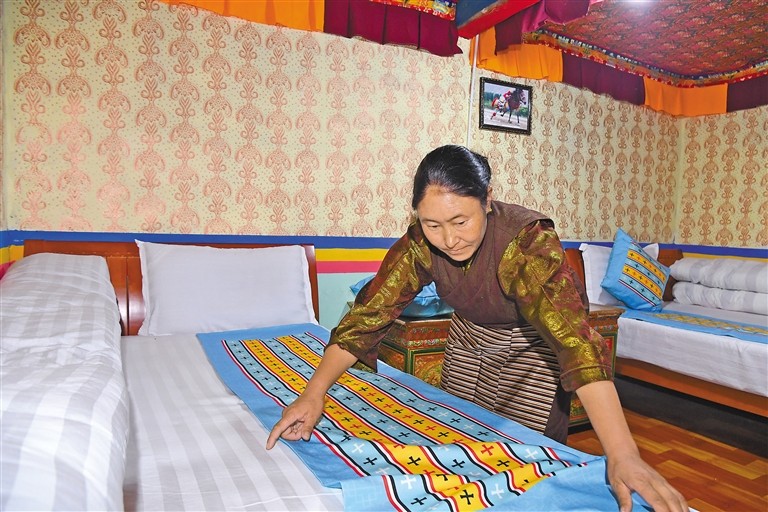 圖為瓊結(jié)縣強(qiáng)吉村的索朗曲珍在整理自家的民宿房間。記者 李洲 攝
