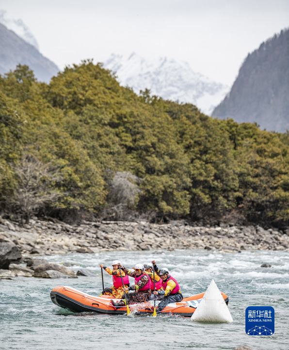 4月16日,在激流漂流筏繞標賽中,“星野新域漂流隊”選手向終點沖擊。他們最終獲得第十名。新華社記者 孫非 攝