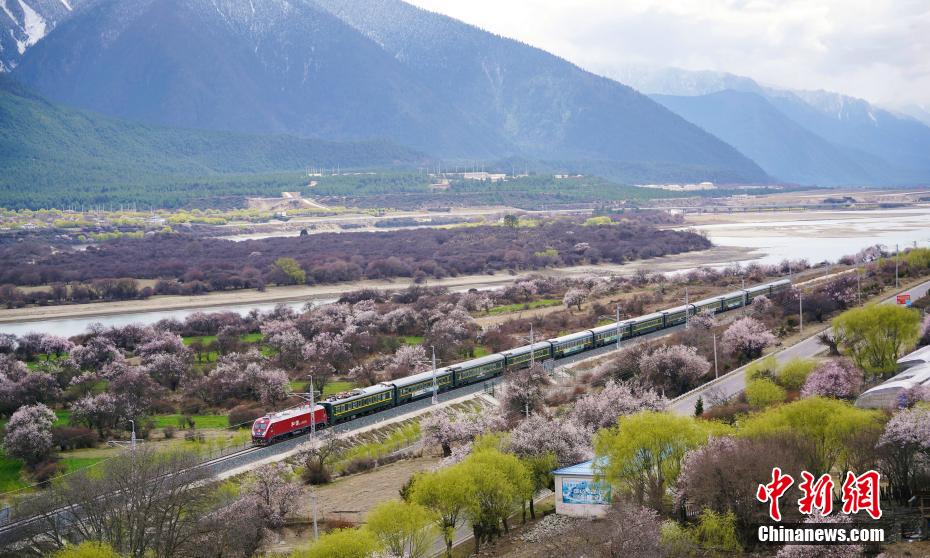 近日,中國鐵路青藏集團(tuán)有限公司介紹,3月下旬至4月,拉林鐵路沿線綿延的野生桃花林盛開,藍(lán)天、白云、桃花、雪山、高原復(fù)興號(hào)動(dòng)車等相互交織,形成了一幅幅美不勝收的畫面。圖為穿梭在桃花林中的拉林鐵路高原復(fù)興號(hào)。