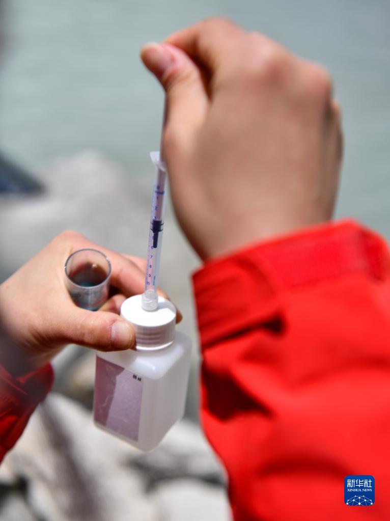 在珠峰登山大本營(yíng)附近,來(lái)自中國(guó)科學(xué)院青藏高原研究所的科考隊(duì)員邱海英在檢測(cè)絨布冰川末端水質(zhì)(5月14日攝)。新華社記者 孫非 攝