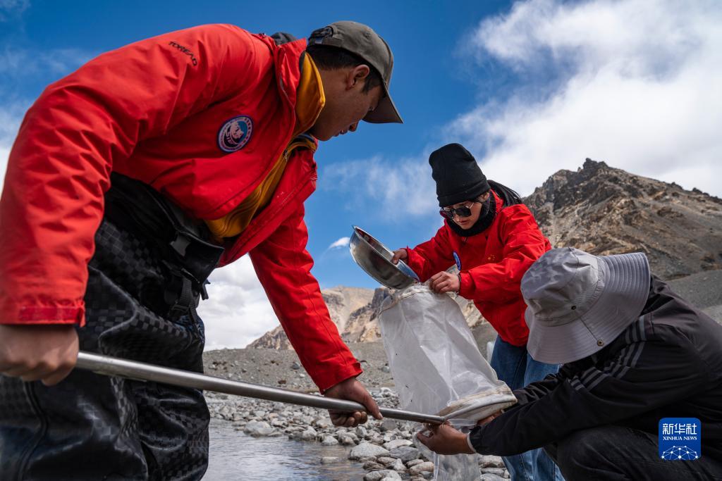 在珠峰登山大本營(yíng)附近,來(lái)自西藏大學(xué)生態(tài)環(huán)境學(xué)院的科考隊(duì)員在采集水生生物樣本(5月22日攝)。新華社記者 孫非 攝